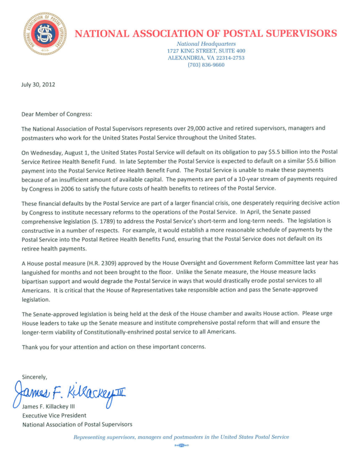 NAPS released a letter to Congress outlining what the effects of the Postal Service’s default on it’s $5.5 Billion Health Benefit Prefunding Obligation. To read the text of the letter, click here (PDF) or click on image below to enlarge.