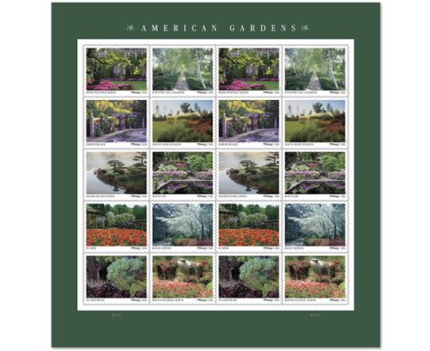 This pane of 20 stamps features 10 different photographs taken between 1996 and 2014. The gardens include: Biltmore Estate Gardens (North Carolina); Brooklyn Botanic Garden (New York); Chicago Botanic Garden (Illinois); Coastal Maine Botanical Gardens (Maine); Dumbarton Oaks Garden (District of Columbia); The Huntington Botanical Gardens (California); Alfred B. Maclay Gardens State Park (Florida); Norfolk Botanical Garden (Virginia); Stan Hywet Hall & Gardens (Ohio); and Winterthur Garden (Delaware).