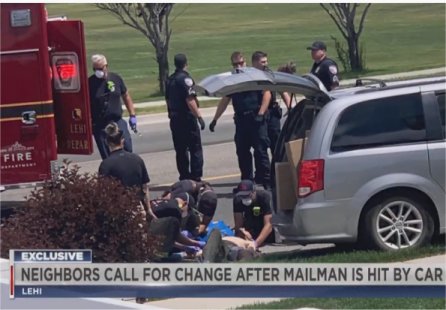 The postal worker was standing at the back of his minivan when a sedan veered to the side of the road and hit and pinned the man between the two vehicles, according to Lt. Toby Peterson with the Lehi Police Department.