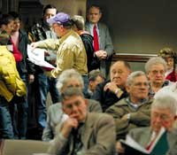Postal union urges campaign to save center Sioux City APW local 186 member Don Stusse, center, left, hands out information to area residents who attend a Wednesday night meeting concerning the a study the Postal Service is doing on the Sioux City mail distribution center. (Staff photo by Jerry Mennenga) |