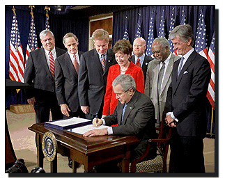 Bush Signs Postal Reform Law President Bush today signed postal legislation into law that benefits residential and business customers by ensuring predictable price increases tied to the rate of inflation. With the President are (from left): Postmaster General John E. Potter, Sen. Thomas Carper (D-DE), Rep. Tom Davis (R-VA), Sen. Susan Collins (R-ME), James C. Miller III, Chairman, Postal Service Board of Governors, Rep. Danny Davis (D-IL), and Rep. John McHugh, (R-NY). |