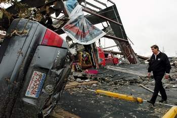 Two Tornados Storm Through PEN's Home Town Alabama's Gov. Riley surveys damage to the Fun Zone located next door to the Montgomery, AL USPS P&DC. The post office on Winton Blount Boulevard has significant damage to its roof, lobby and customer parking areas. |
