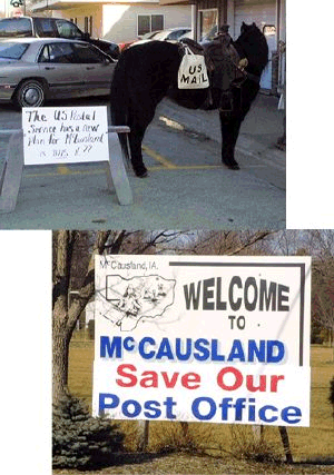 Rural community takes on U.S. Postal Service One McCausland resident used this horse (seen tied up on Salina Street) to make his point about the U.S. Postal Service's plan to suspend the town's post office. BOTTOM: Other residents were more direct about their wishes. PHOTOS: Scott Campbell |